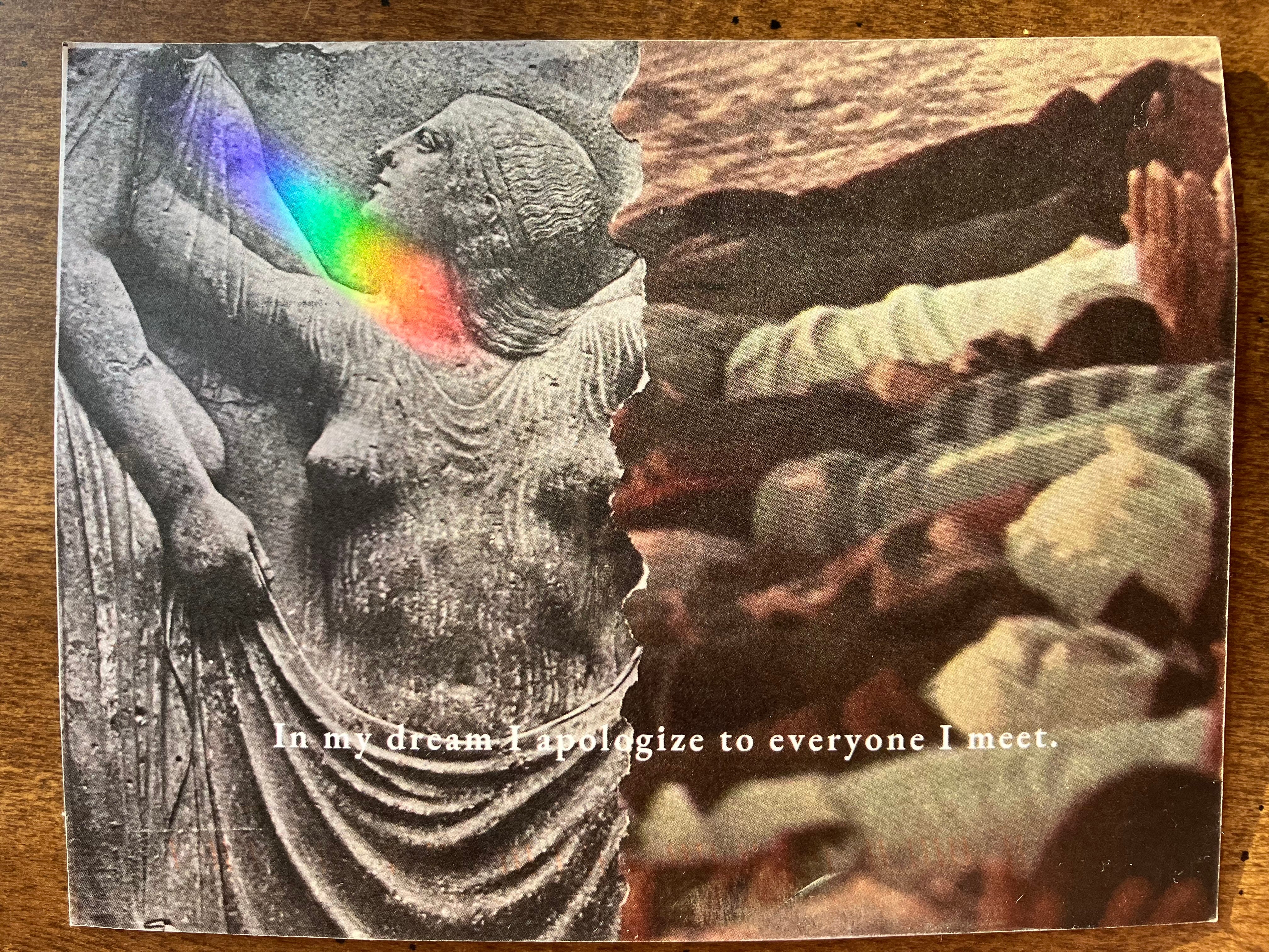 A few months after Valor was born, we began receiving anonymous art postcards addressed to him. It’s always a collage with a quote. We have no idea who they’re coming from, there’s never a message on the back. Last month, the quote was this: “In my dream I apologize to everyone I meet.” Most of the postcards we recycle at the end of the month. But this one, I’ve held onto.